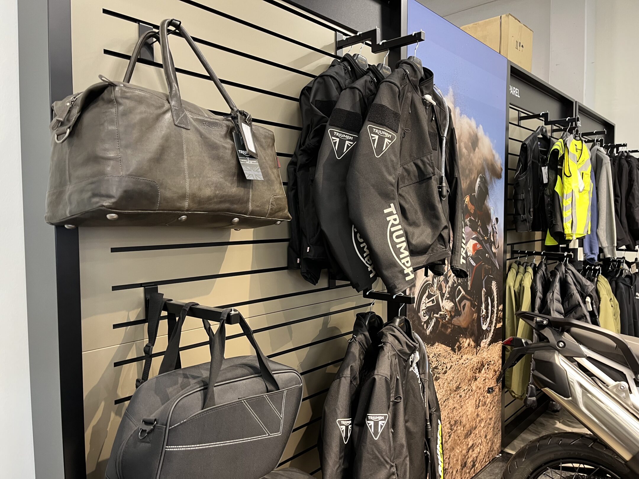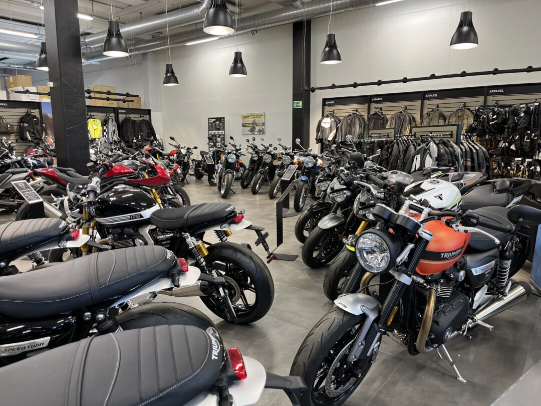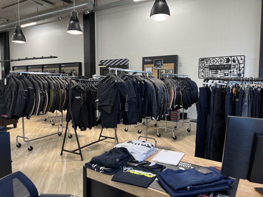 Det enorme Triumph lokalet skal tømmes for å gjøre plass til KTM og det er mye utstyr i butikken.